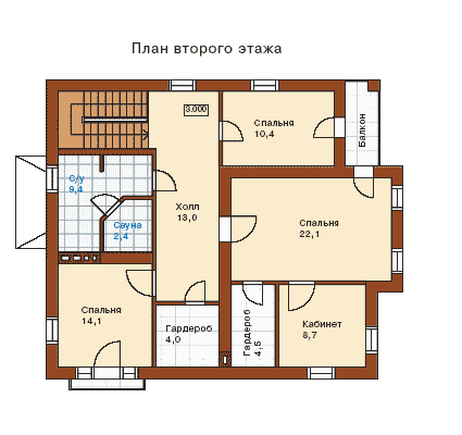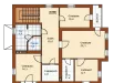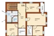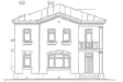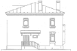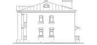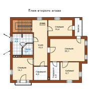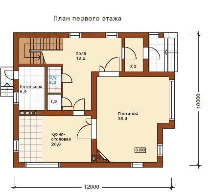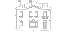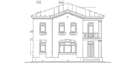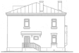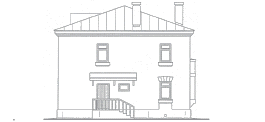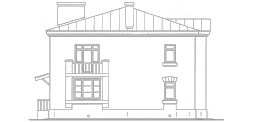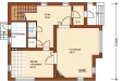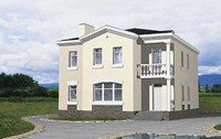 Над небольшим крыльцом расположен балкон, выполняющий так же функцию крыши для парадного входа. Ввиду отсутствия цокольного этажа вспомогательные помещения находятся на первом этаже. К ним стоит отнести котельную, вход в которую размещен с улицы. Самой большой комнатой в особняке является гостиная, в углу которой запроектирован камин. Кухня и столовая совмещены в одно помещение и имеют вход из гостиной. Все спальни находятся по проекту на втором этаже.