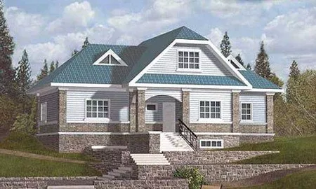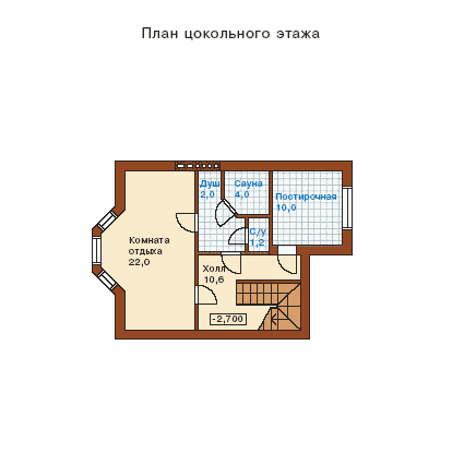 Запоминающийся проект двухэтажного загородного дома площадью отлично подойдет для земельных участков со сложным многоуровневым ландшафтом. Цоколь находится на повышенном уровне и позволяет строительство коттеджа так же и на участке со сложным грунтом. Цоколь в этом коттедже предназначен для организации зоны отдыха, состоящей из сауны, комнаты отдыха, душевой и санузла. Тут же находится и вспомогательное помещение в виде постирочной.