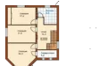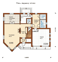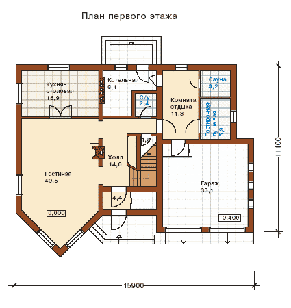 Широкий дверной проем на первом этаже соединяет гостиную, оборудованную камином, и кухню-столовую. Кроме того на первом этаже находится котельная и помещение под хозяйственные нужды.