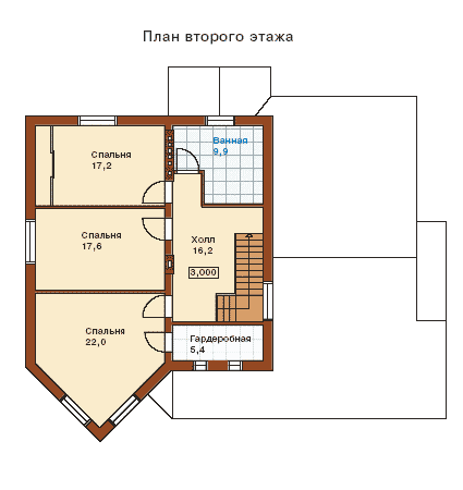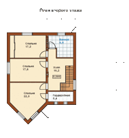 Спальная зона запроектирована на втором этаже, при этом «хозяйская» спальня оборудована собственной гардеробной. Так же на этаже предусмотрена общая ванная комната.