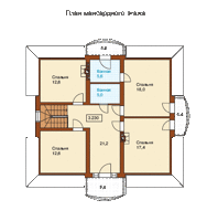 Большая терраса площадь 22,9 кв. м., протянувшаяся вдоль всей задней стены дома, имеет выход из помещения просторной гостиной комнаты прямоугольной формы. Так же с террасы можно попасть в небольшую котельную, которая, впрочем имеет дополнительный вход из прихожей дома. По периметру второго этажа размещены четыре спальные комнаты, объединенные по центр одним общим холлом.