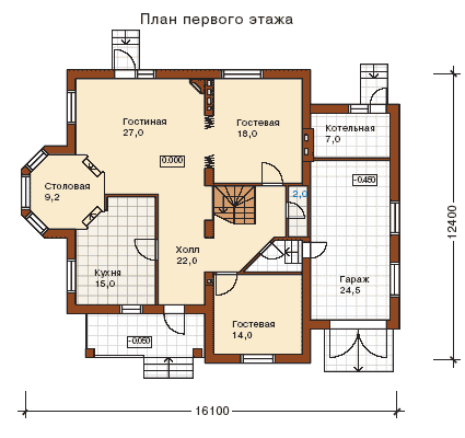 На первом этаже в зоне дневного пребывания предусмотрены большая кухня, просторная гостиная с камином и выходом в сад, холл с лестницей и две гостевые спальни. Интересно продумано решение для столовой: под неё отведено место на невысоком подиуме в помещении трёхгранного эркера. Доступ к обеденному столу открыт, как со стороны кухни, так и со стороны гостиной. Одну из гостевых спален можно переоборудовать в кабинет или за счёт неё увеличить площадь гостиной. Гараж и котельная находятся в помещении пристройки к основному объёму здания.