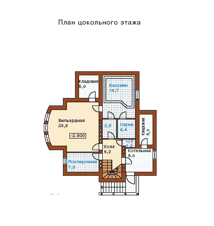 Цокольный этаж подразделяется на две части: территорию отдыха и релакса, вмещающую в себя бассейн с небольшой сауной и бильярдный зал, а так же зону технических и прочих хозяйственных помещений из котельной, прачечной, кладовых.