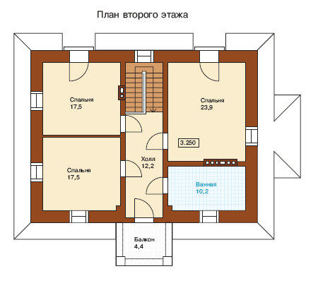 Внутреннее пространство мансардного этажа благодаря резкому уклону кровли и мансардным слуховым окнам имеет уютные, пластичные формы. На его площади разместились три просторные спальни и большая ванная комната.