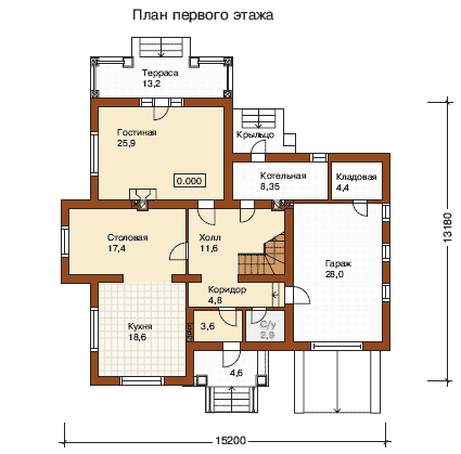 На первом этаже дома расположены помещения хозяйственно-бытового блока, встроенный гараж для одной автомашины и зона дневного пребывания обитателей коттеджа.