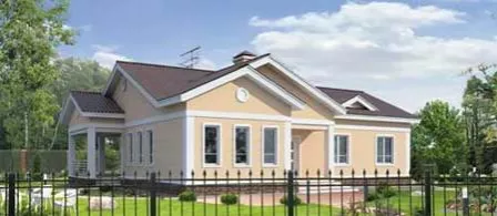 Одноэтажный коттедж из газоблоков 14 х 19 м с фигурной крышей