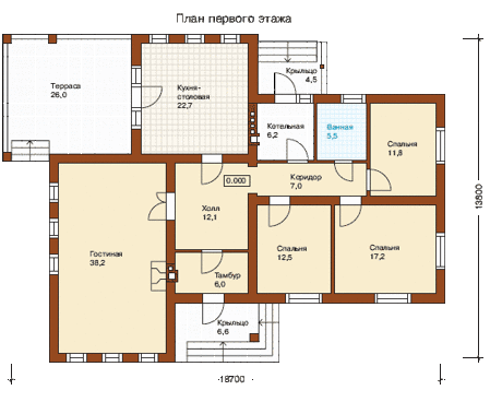 Дом имеет просторную гостиную, светлый холл, так же есть кухня-столовая и общий санузел. С территории кухни возможно попасть на открытую придомовую террасу, которая отлично подойдет для летних обедов всей семьей или гостями. Парадный вход с двумя фронтонами, достаточно низкий цоколь и приятная глазу цветовая гамма общего оформления, удачно гармонируют и прекрасно дополняют друг друга. Фасад дома – это декоративная штукатурка с применением искусственного камня.