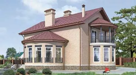 Двухэтажный коттедж из газоблоков с полукруглыми эркерами