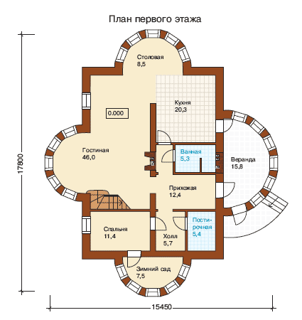 Самый большой эркер представляет собой остеклённую веранду-тамбур на входе, через которую можно попасть внутрь дома, встречающего нас просторной прихожей. Арочный проём отделяет прихожую от внушительных размеров каминного зала с лестницей, который плавно перетекает в расположенную в эркере столовую и, далее, в кухню.