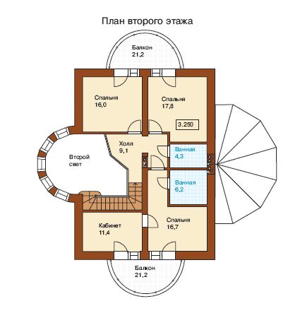 Четыре спальни для членов семьи, каждая с собственным выходом на балкон, гармонично разместились на втором этаже особняка - в зоне отдыха. По желанию в одной из спален можно оборудовать кабинет для хозяина дома.