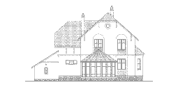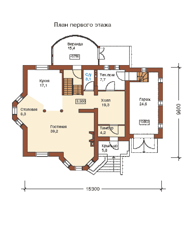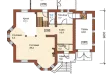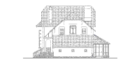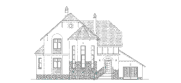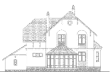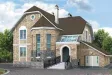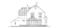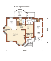 С широкого крыльца, обрамлённого коваными перилами, через арочный портал главного входа попадаем в просторный холл, с которого начинается единое пространство первого этажа, сформированное из гостиной, столовой и кухни. Пространством, отведённым под зону гостиной, является двусветный эркер с камином и прилегающая к нему площадь, разграниченная с зоной кухни и столовой двумя стройными колоннами. Правое крыло первого этажа дома - это хозяйственно-бытовой блок из помещений под гараж, котельную и санузел.