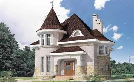 Кирпичный особняк в ярком замковом стиле придется по вкусу сторонникам дизайна прошлых времен. Этому коттеджу присущи черты французского стиля шато, подмеченного башенкой и остроконечной крышей. Благородство и монументальность общего экстерьера заставляет обратить внимание на данный проект. При общей площади 149,5 кв. м. в особняке имеются все помещения, нужные для комфортабельной жизни небольшой семьи.