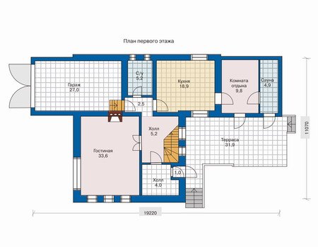 Проект кирпичного особняка с двумя этажами и современной архитектурой отлично подходит для воплощения среди городской коттеджной застройки и будет достаточно актуально смотреться благодаря современной отделке фасадов и простым правильным линиям экстерьера. Внутрь дома ведет просторная терраса размером 31,9 кв. м. с двумя лестницами, предваряющая парадный вход. В проекте предусмотрено помещение под гараж площадью 27 кв. м., что позволяет разместить в нем не только одно авто, но и довольно большое количество автомобильных принадлежностей.