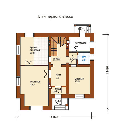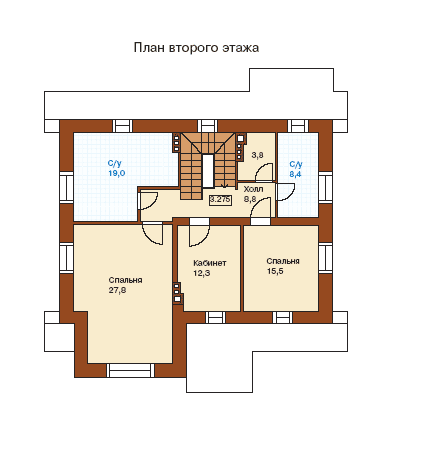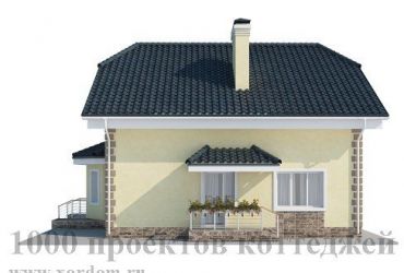 Компактный двухэтажный загородный дом из кирпича рассчитан на постоянное проживание. Строгость внешнего вида фасада поддерживается классическими элементами облицовки. Главным помещением дома является большая гостиная с камином, вокруг которого так приятно посидеть вечером в кругу семьи. Спальная комната на первом этаже вполне может быть использована в качестве кабинета вместо аналогичного на втором этаже. По причине того, что проектом не предусмотрен цокольный этаж, дом можно строить даже на участках с высоким уровнем грунтовых вод.