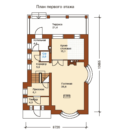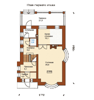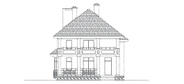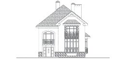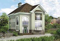 Данный проект кирпичного особняка будет идеальным решением для земельных участков со сложными грунтами, так как полностью лишен цоколя и подвала. Коттедж предполагает два этажа с просторной придомовой террасой и таким же по площади балконом над ней. Фасады дома украшены полукруглым немного выступающим эркером высотой в оба этажа и собственной небольшой крышей, изящными колоннами, обрамляющими террасу, а также большой площадью остекления, за счет чего внутренние помещения коттеджа хорошо освещены солнечным светом в течение дня.
