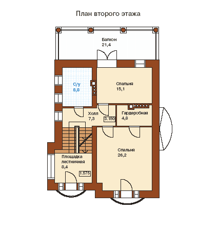 Две спальни, общая гардеробная и санузел занимают всю территорию второго этажа.