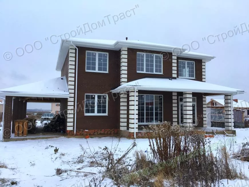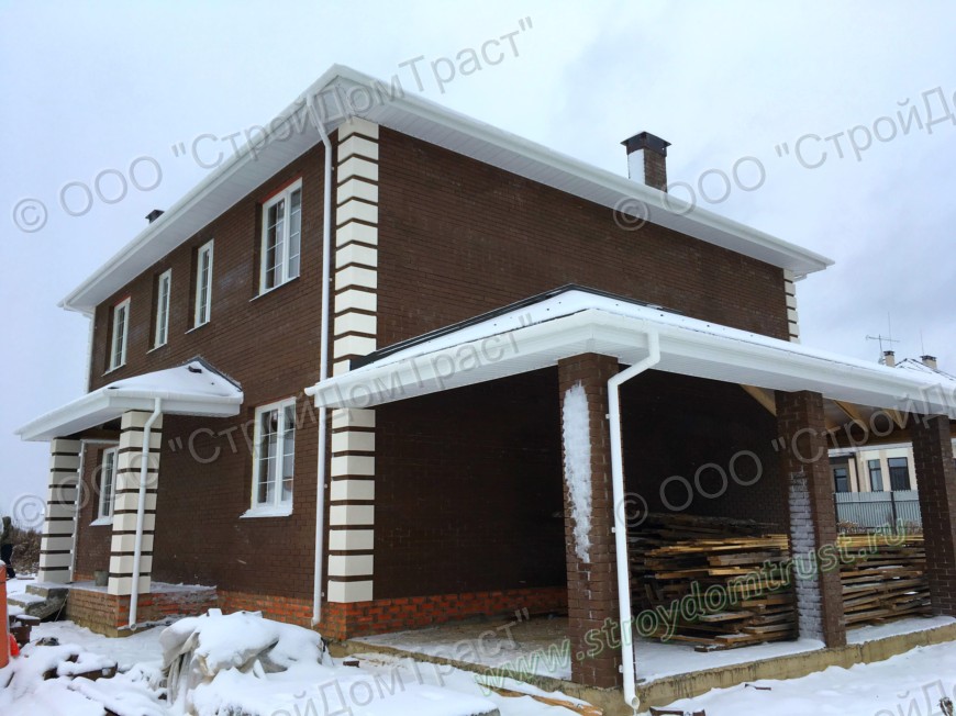 Дом имеет достаточно простую геометрию и лаконичное оформление. Стены покрыты облицовочным кирпичом. Производители предлагают широчайшую палитру для этого отделочного материала, так что цвет коттеджа может быть практически любым. На углах здания русты - элегантные украшения в классическом стиле. Поддерживают классические мотивы и большие окна с простым, но изящным декором.
