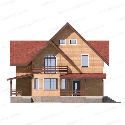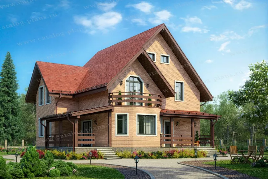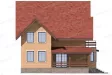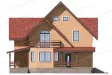 Дом выглядит эффектно и современно за счет необычной формы здания и узора, который образуют на стенах окна разного размера и формы. Интересными деталями в этом проекте являются крыша с эффектом двойного фронтона и расположенный под малым фронтоном балкон с панорамным шестиугольным двустворчатым окном. Большое крыльцо и терраса под навесом, опоясанные деревянными перилами придают дому уютный вид.