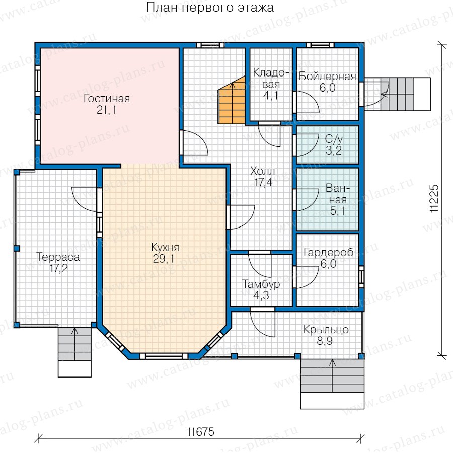 На первом этаже располагается просторная кухня (29,1 кв.м) с эркером. На такой кухне хозяйка сможет разместить кухонный гарнитур своей мечты, а так же все необходимое для трапезы в большой компании гостей. Из кухни есть выход на террасу под навесом (17,2 кв.м), здесь получится прекрасная зона отдыха, а в теплое время года удобно устраивать застолья прямо на свежем воздухе. С кухней сообщается гостиная (21,1) здесь поместится все, что нужно для отдыха в кругу семьи. Для удобства хозяев дома и их гостей внизу предусмотрен раздельный санузел: туалет (3,2 кв.м) и ванная (5,1 кв.м). Также на этаже находятся тамбур (4.3 кв.м), гардеробная для верхней одежды (6 кв.м), кладовая (4,1 кв.м) и бойлерная (6 кв.м). Соединяет все помещения эргономичный холл (17,4 кв.м).