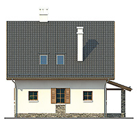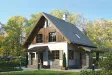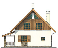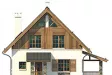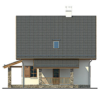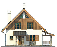 Для небольшой семьи проект каркасного дома с тремя спальнями на мансардном этаже будет самой настоящей находкой. Деревянная отделка стен второго яруса, перил террасы и крыльца чудесно сочетаются с имитацией каменной кладки с пилонами у входов и цоколя здания. В двускатной крыше располагается окно, что сегодня в тренде.