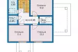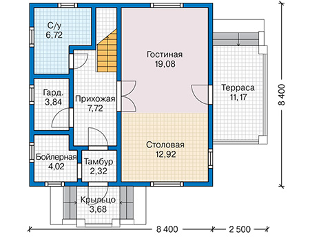 На первом этаже запланированы: тамбур, гардероб, прихожая, бойлерная, санузел, лестница на мансарду. Из прихожей через дверь можно попасть в просторное помещение, которое выполняет сразу три функции: столовой, кухни и гостиной. Зонирование здесь делается при помощи правильно расставленной мебели. Благодаря трём большим окнам в помещении светло и уютно. Из гостиной-столовой есть второй выход — на террасу.