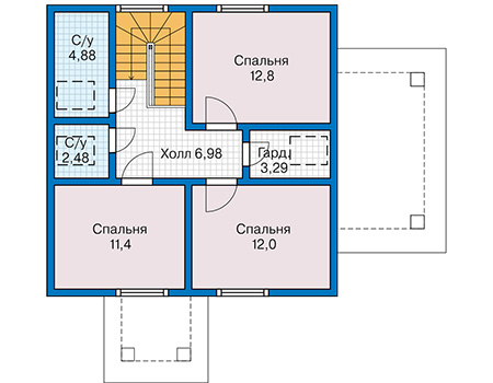 Второй этаж можно назвать спальным. Кроме трёх спален здесь запланированы холл, два санузла и гардероб.