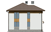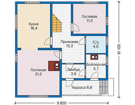Отсюда можно попасть внутрь дома. Сначала вошедшего встречает небольшой тамбур. Из него ведут две двери: в бойлерную и прихожую. В прихожую имеется четыре входа. Они идут в гостевую, гостиную, кухню и санузел. Здесь же расположена лестница на второй этаж. Гостиная и кухня соединены широкой аркой. В каждом из этих помещений имеется по паре окон.