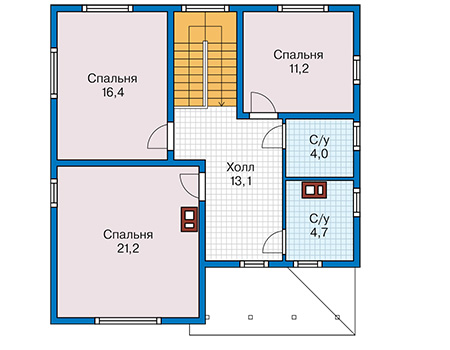 На верхнем ярусе находятся три спальни разного размера и два санузла. Посередине этажа располагается просторный холл.