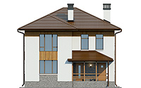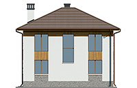 Двухэтажный дом под ломаной вальмовой крышей притягивает взор. Сразу видно, что внутри него светло и уютно: на это указывают огромные окна здания. Некоторые вовсе не имеют внутренних межрамовых перегородок. Широкие большие оконные стёкла разделены непривычным образом. Необычно смотрится и фигурный козырёк над террасой со ступенями.
