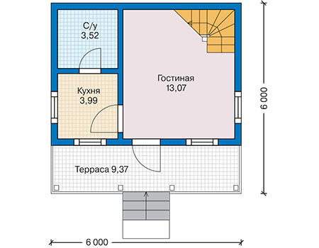 Планировка дома эргономична и удобна. На первом этаже располагается уютная гостиная (13,07 кв.м), где вы сможете отдохнуть после работы в саду или скоротать дождливый день за чтением и просмотром любимых передач. Рядом с гостиной — небольшая светлая кухня (3,99 кв.м), куда поместится необходимый минимум для приготовления и приема пищи. Также внизу есть санузел, куда поместится душевая кабина. На входе в дом — терраса (9,37 кв.м), она станет прекрасным местом отдыха для всей семьи.