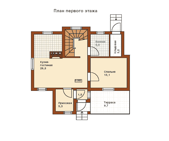 На первом этаже находится удобная кухня-гостиная (26,8 кв.м), спроектированная таким образом, чтоб можно было легко выполнить необходимое функциональное зонирование помещения. Также внизу находятся уютная спальня (13,1 кв.м.), прихожая (5,3 кв.м), ванная (5 кв.м). С заднего двора есть вход в небольшую кладовую (3,2 кв.м), в которой удобно хранить садовый инвентарь и другие необходимые для работы во дворе вещи. К дому примыкает открытая терраса (9,7 кв.м), на которой можно устроить прекрасное место для отдыха и встреч с друзьями.