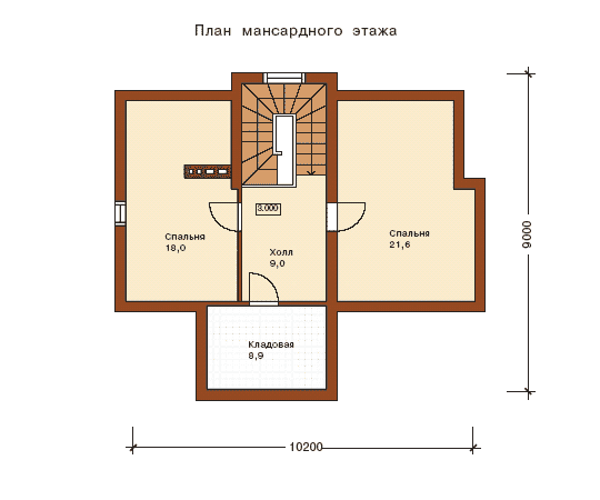В мансардном этаже находятся две спальни (18 и 21,6 кв.м) и кладовая (8,9 кв.м). Соединяет помещения функциональный холл (9 кв.м).