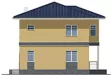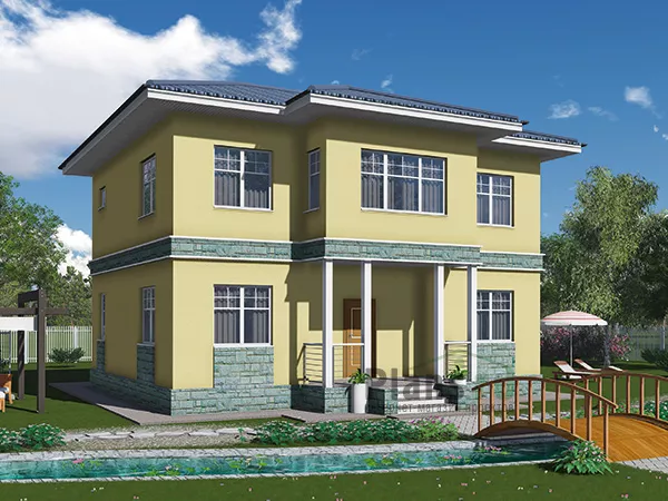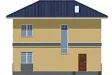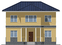Двухэтажный дом на 163 квадратных метра с полноценным верхним ярусом выглядит чрезвычайно презентабельно благодаря роскошному крыльцу с белыми квадратными пилонами. Колонны поддерживают эркер второго этажа. Поэтому верхний ярус имеет большую площадь по сравнению с нижним.