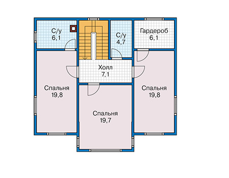 На втором этаже располагаются три спальни почти равного размера. Между ними находится холл с выходами в комнаты и санузел. Из одной спальни имеется вход во второй санузел. Из другой спальни дверь ведёт в гардеробную.
