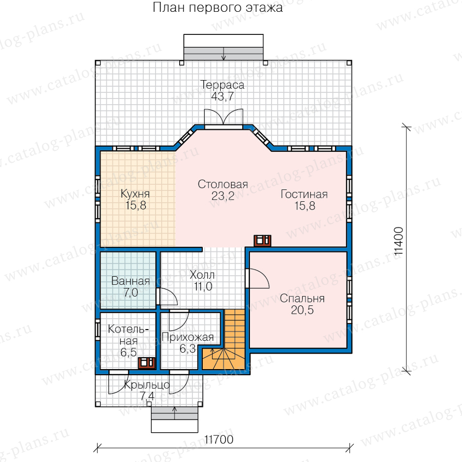 Почти половина первого яруса отдана под столовую, гостиную и кухню. Это одно большое помещение, которое разделяется зонированием. Комната-студия снабжена 10 окнами, поэтому здесь очень светло. Выход на террасу располагается в выступе эркера.