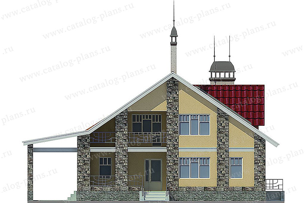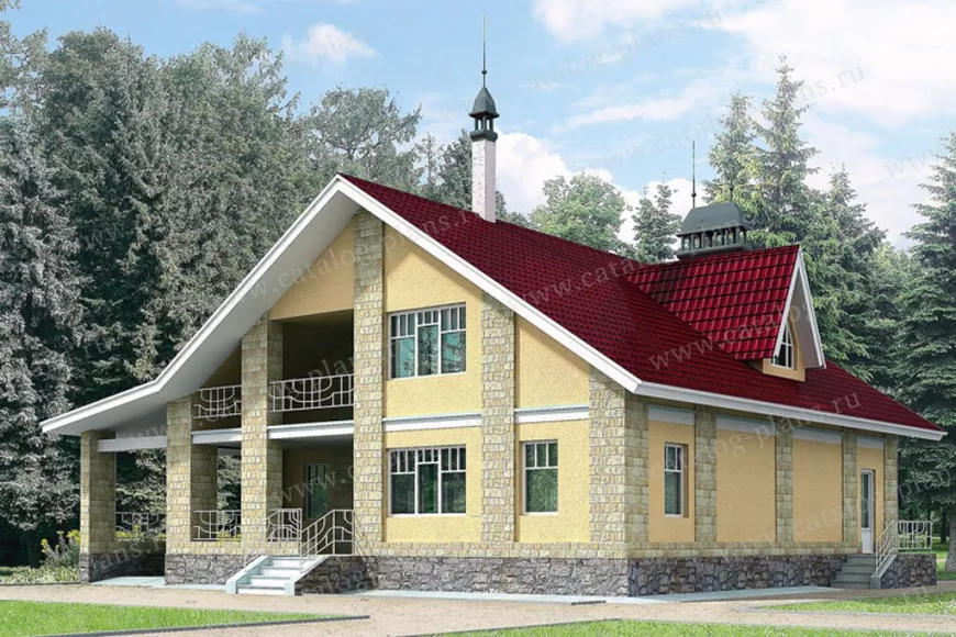 Дом имеет довольно простую форму, но благодаря необычной ассиметричной крыше и широким колоннам под навесом и возле входной группы, он выглядит многоуровневым и рельефным. На фасаде сочетаются штукатурка и облицовочный камень. Камнем оформлены колонны и из него же выложены вертикальные полосы на стенах, повторяющие форму колонн, такой узор визуально делает коттедж выше. Кроме того, стены украшены молдингом. Кованые перила гармонируют с узором на окнах, добавляя дому изящества и шарма.