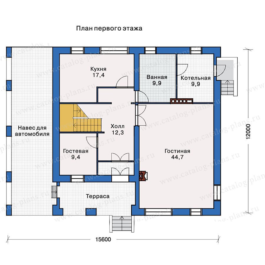 На первом этаже располагается просторная гостиная (44,7 кв.м) с камином для уютных вечеров в кругу семьи или друзей. Площадь и форма комнаты позволит разместить в ней все необходимое для отдыха и воплотить любые дизайнерские задумки при ремонте. Также на этаже находится эргономичная кухня (17,4 кв.м) с хорошим естественным освещением. В доме предусмотрена небольшая гостевая комната (9,4 кв.м), которая может использоваться в качестве рабочего кабинета. Помимо прочего, этаж оборудован удобным санузлом (9.9 кв.м), небольшим тамбуром, холлом (12,3 кв.м) и котельной (10 кв.м) с дополнительным входом с улицы.