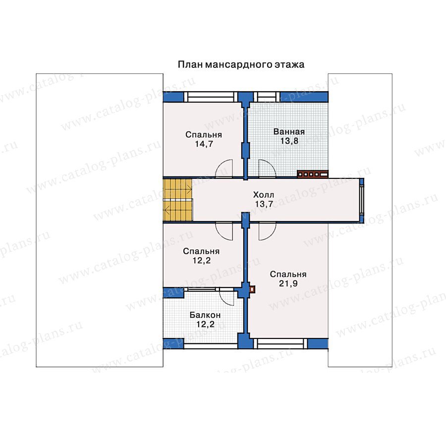 В мансардном этаже располагаются три комфортабельные спальни: 22, 15 и 12 кв.м. Самая маленькая спальня имеет выход на просторный балкон (12,2 кв.м), из которого получится прекрасная зона отдыха для теплого времени года. Также на этаже есть санузел (13,8 кв.м), в котором поместится и ванная, и душевая кабина. Соединяет все помещения необычный холл с окном, где хватит места для небольшого зимнего сада или дополнительного рабочего места.