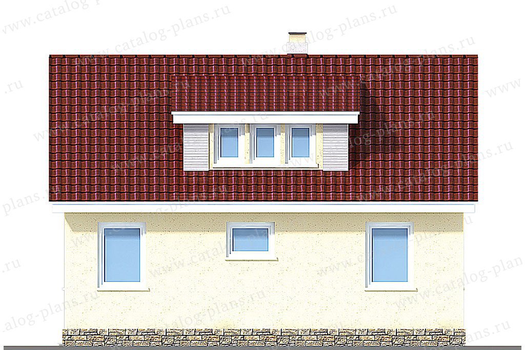 Этот дом придется по вкусу любителям простых архитектурных форм. Стены дома оформлены декоративной штукатуркой. Производители предлагают широкий выбор оттенков для этого отделочного материла, поэтому цвет дома может быть практически любым. Оконные и дверные проемы украшены лаконичным наличниками в классическом стиле. Двускатная крыша с двумя симметричными щипцами придает дому уютный вид.