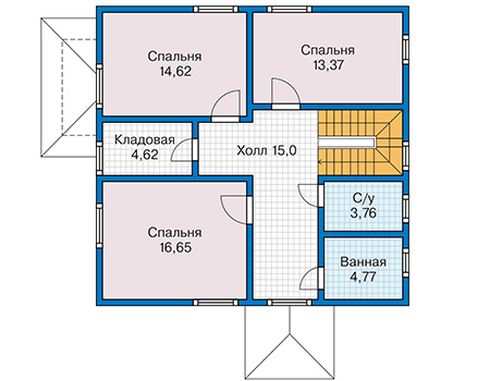 Из-за отсутствия эркера площадь второго этажа несколько меньше, чем на первом. Здесь запланированы холл, три спальни, санузел и ванная. Наличие большого количества окон делает все помещения светлыми.