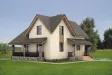 Удачный проект небольшого загородного особняка с приятным внутренним и внешним дизайном и общей площадью 142 кв. м. Это одноэтажный коттедж с мансардой, большим крыльцом и двумя просторными террасами по бокам. Отсутствие цокольного этажа, встроенного гаража и небольшие габариты делают данный проект довольно доступным постоянным жильем для современной небольшой семьи.